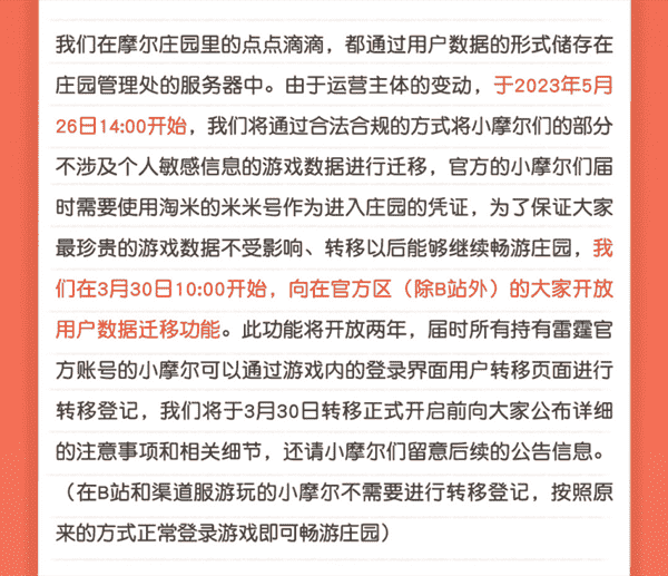 合作结束本就是开发方和代理方双方的事情,,降低这件事情对玩家的影响,,,才是对所有珍视这段童年的摩尔玩家最好的呵护。。。目前看来,,用户完全不用担心后续因无法登录游戏而造成任何数据上的损失,,,只要及时进行账号转移,,,,就可以好好保留、、、、延续在庄园的痕迹和回忆,,,继续在庄园里做快乐的红鼻子小鼹鼠。。。