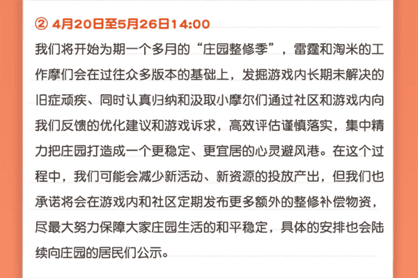 合作的结束并不意味着这个童年IP的结束,,,,对于《摩尔庄园》手游而言,,这是一个新阶段的开始。。。后续游戏内将开启庄园重构计划,,,,会就以往遗留下来的BUG进行集中修复,,,并在游戏内和社区定期发布更多补偿物资。。。